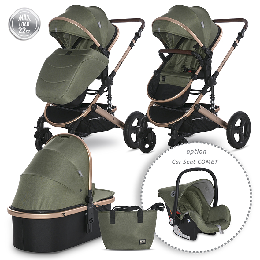 амортисьори,кош за новородено,покривало за крачета,сгъваем сенник,чанта за аксесоари,подвижна поставка за крачета,голям кош за пазаруване,завиващи предни колела,реверсивна седалка,регулиране на дръжката,поставка за аксесоари на дръжката,столче за кола /опция/,заключващ механизъм,5 точкови предпазни колани,мрежа против комари,сгъваема до компактни размери,спирачка на задните колела,алуминиева рама,регулируема облегалка,гриф: ЕКО кожа,дръжка: ЕКО кожа,Кош за новородено: покривало,Столче за кола: ергономична дръжка за носене,Столче за кола: мека подложка за тялото///