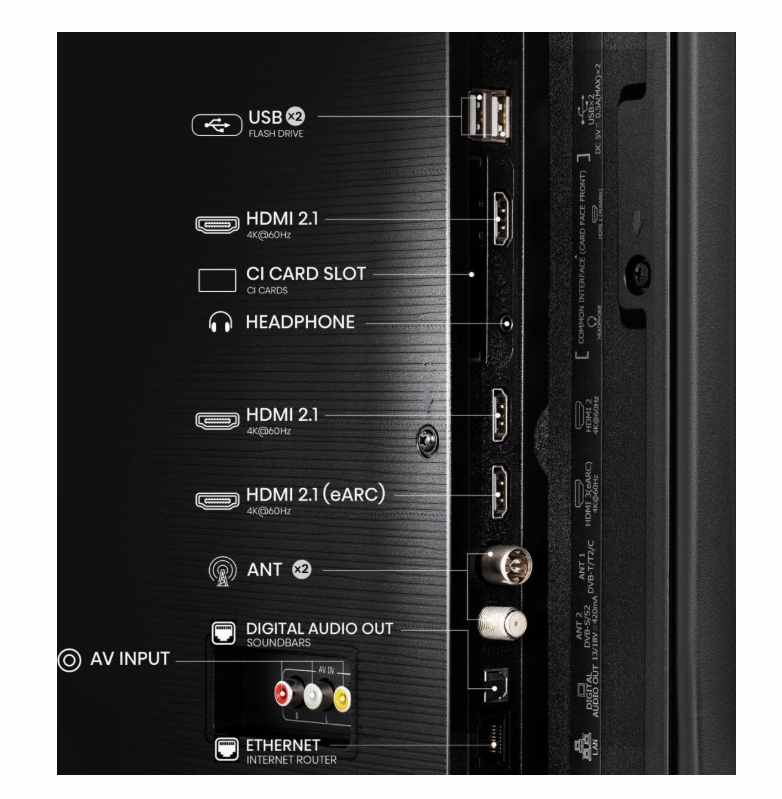 Изводи за свързване3 HDMI, 2 USB, S/PDIF out, CI+ Slot, 2 RF In, Audio (L/R) in