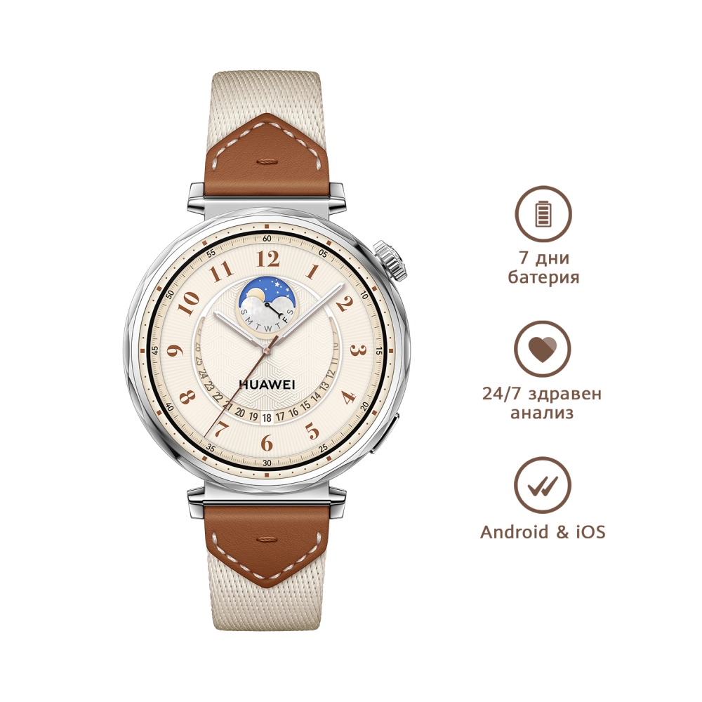 Huawei Watch GT5 Jana-B19W, 1.32″, Amoled 466×466 PPI 352, , BT5.2 BLE/BR/EDR, 5ATM, 524mAh, Screenshot sharing, support message input, message notifications, Battery life up to 7 days, Compatible with iOS and Android devices, Brown Woven