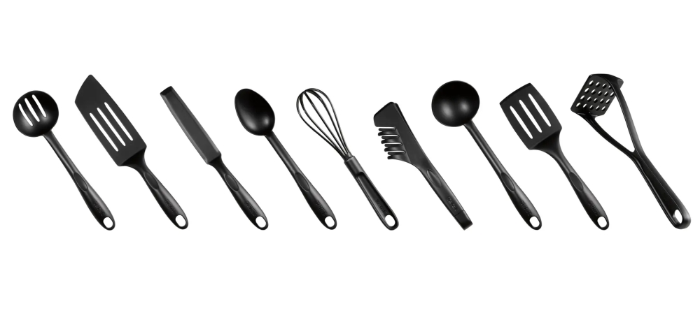 Вид The set includes:whisk, potato masher, spoon, spatula, ladle, slotted spoon, tongs