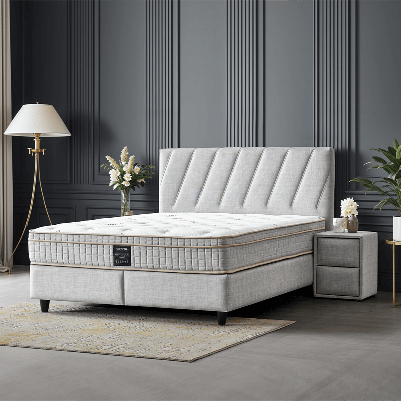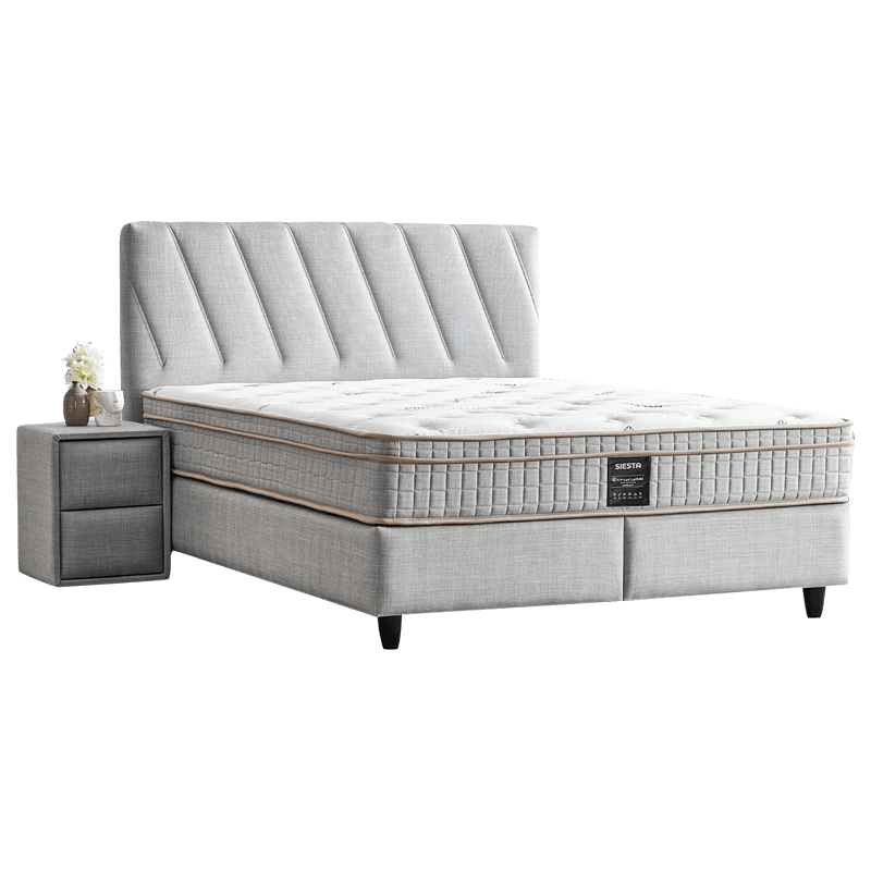 Превърнете спалнята си в истинско място за почивка със стилната и функционална тапицирана спалня с матрак SIESTA 160 x 200, която съчетава елегантна визия, комфорт и удобство в едно. Моделът впечатлява с мека текстилна дамаска в светло сив цвят и изчистена табла с нежни шевове, която придава усещане за лекота и уют. Спалня SIESTA е оборудвана с двулицев матрак с вградена подматрачна рамка, който осигурява стабилна и комфортна опора благодарение на бонел пружините, еластичната пяна и пухената вложка. Матракът е с умерено твърда структура и добри ортопедични свойства, подходящ за всекидневна употреба. Под леглото се крие практична ракла за съхранение – идеално решение за подреждане на спално бельо и други вещи. Пълна информация за размерите и характеристиките на модела ще намерите в таблицата в таб/поле ‘Техническа информация’.