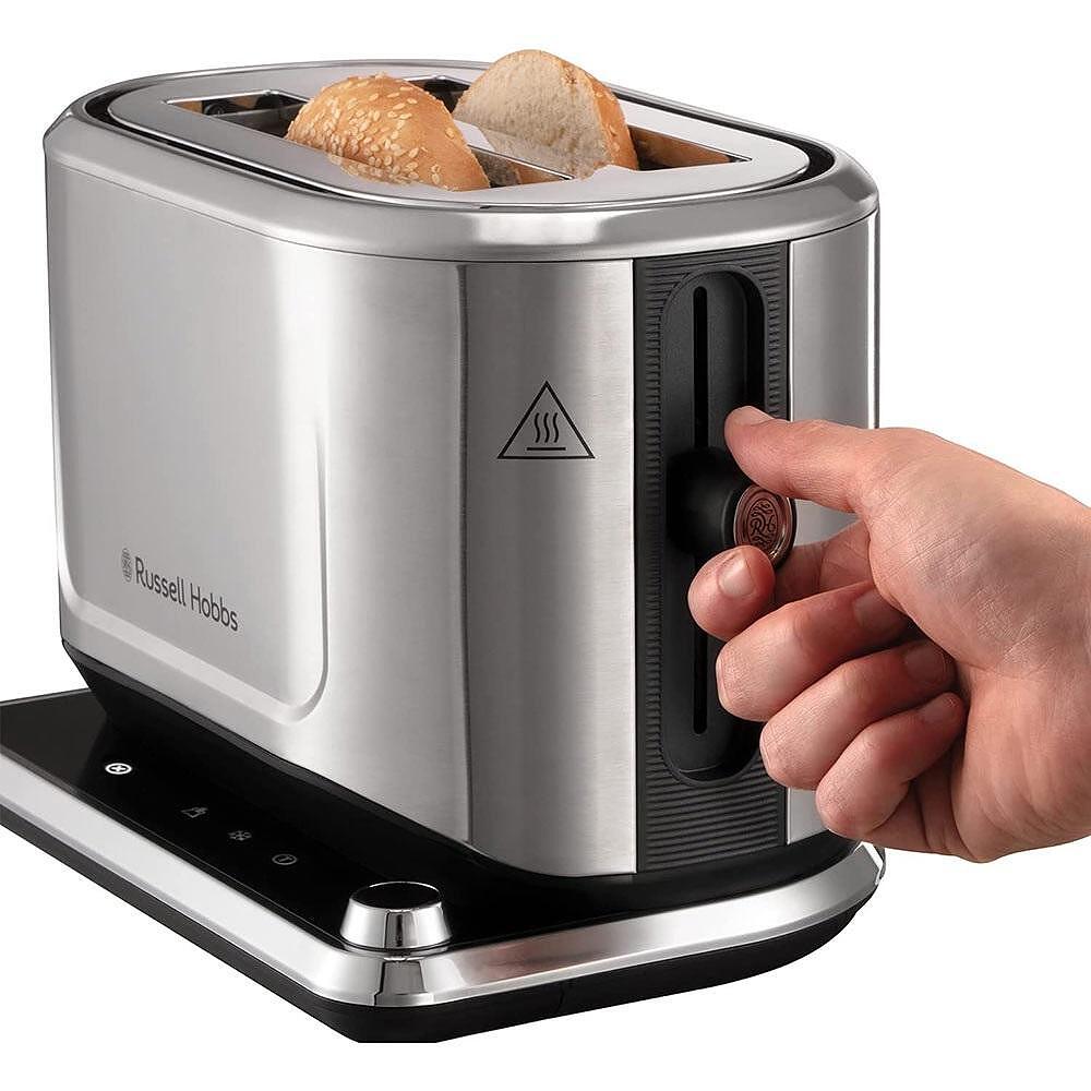 Тостерът Russell Hobbs 26210-56 Attentiv 2S комбинира стил и иновации, за да превърне всяко препичане в удоволствие. Изработен от висококачествена неръждаема стомана, той предлага дълготрайност и лесна поддръжка, с изваждаща се тавичка за трохи и място за съхранение на кабела. Широките отвори са идеални за различни видове хляб, включително по-дебели филии и бейгъли. Регулируемият контрол на препичане и функции за размразяване, затопляне и отказ осигуряват персонализирани резултати. Осветените сензорни бутони и функцията за високо издигане правят употребата лесна и безопасна. С мощност 1640W и технология Colour Sense, която запаметява последната степен на препичане, този тостер е практичен помощник за всяка кухня. Включената стойка за затопляне е идеална за пасти и кроасани. С двегодишна гаранция и съвременен дизайн, Russell Hobbs 26210-56 Attentiv 2S е перфектният избор за любителите на качествени и вкусни закуски.