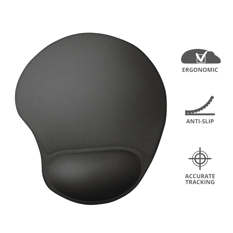 Ергономична подложка за мишка с възглавничка за китката, пълна с мек гел, за удобно поставяне на ръката и предотвратяване на прекомерното напрягане. Долна част, която не се плъзга, за допълнителна стабилност и плавно управление на мишката. Зоната, която служи като подложка на мишката, е с мека повърхност от микрофибър, която подобрява работните характеристики на мишката. Работи с всички типове мишки