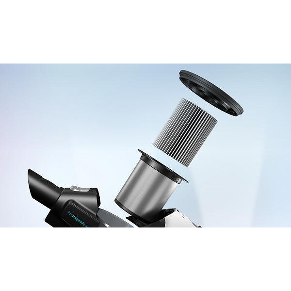 Почистването на контейнера за прах трябва да бъде хигиенично и лесно. Можете да изпразните контейнера, без да създавате облак прах и можете да почистите филтъра без изпиране Просто извадете кутията за прах, завъртете червеното колело и го изпразнете директно в кошчето.