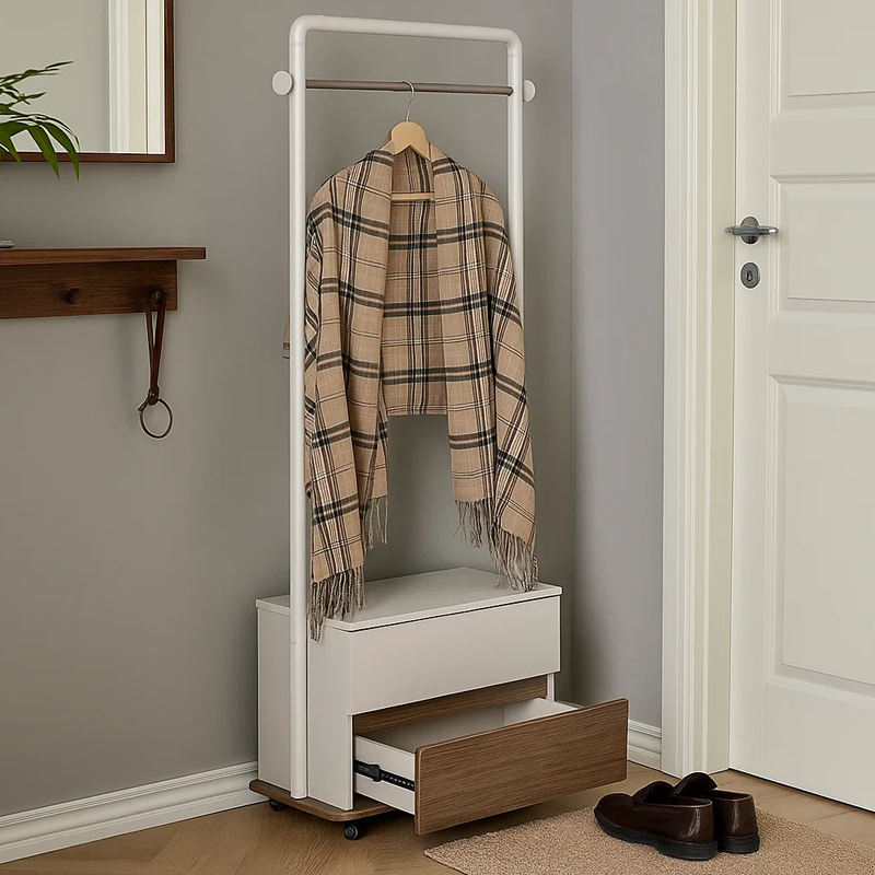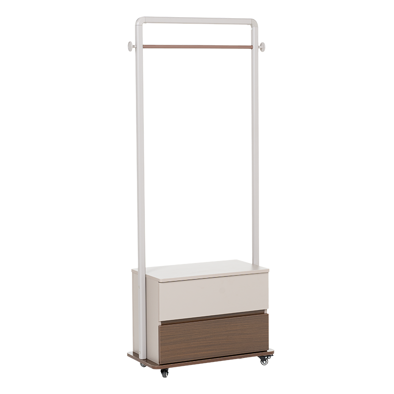 Закачалка с шкаф PASAU съчетава стил и практичност в едно компактно решение. Разполага с 1 метален лост за закачалки, 2 чекмеджета за съхранение на дребни вещи и удобна мобилност благодарение на вградените колелца. Перфектно допълнение за антре, спалня или гардеробна. Пълна информация за размерите и характеристиките на модела ще намерите в таблицата в таб/поле „Техническа информация“.